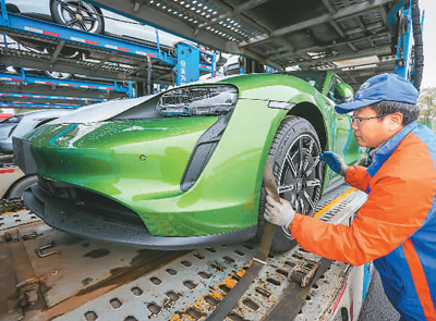 去年底,进口整车保税仓储展示功能在松江综合保税区首次落地,该保税区成为上海首家开展高端进口汽车保税展示业务的综合保税区。图为一批进口保时捷整车日前抵达上海松江综合保税区,工作人员正在卸货。蔡斌摄(人民视觉)