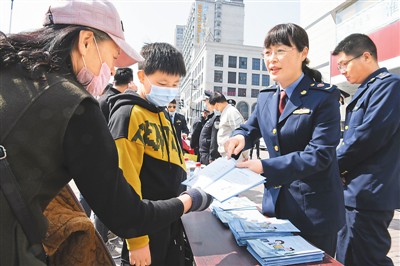 2020年,安徽淮南市市场监督管理局工作人员通过漫画手册向群众讲解知识产权保护知识。陈彬摄(人民视觉)