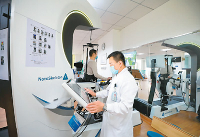 3月30日,患者在北京航空总医院康复医学科的国内首个完全自主知识产权的下肢康复机器人的帮助下,进行精准康复训练。张建房摄(人民视觉)