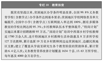 发展教育脱贫一批。坚持再穷不能穷教育、再穷不能穷孩子,加强教育扶贫,不让孩子输在起跑线上,努力让每个孩子都有人生出彩的机会,阻断贫困代际传递(见专栏10)。持续提升贫困地区学校、学位、师资、资助等保障能力,20多万名义务教育阶段的贫困家庭辍学学生全部返校就读,全面实现适龄少年儿童义务教育有保障。实施定向招生、学生就业、职教脱贫等倾斜政策,帮助800多万贫困家庭初高中毕业生接受职业教育培训、514万名贫困家庭学生接受高等教育,重点高校定向招收农村和贫困地区学生70多万人,拓宽贫困学生纵向流动渠道。开展民族地区农村教师和青壮年农牧民国家通用语言文字培训,累计培训350万余人次,提升民族地区贫困人口就业能力。“学前学会普通话”行动先后在四川省凉山彝族自治州和乐山市马边彝族自治县、峨边彝族自治县、金口河区开展试点,覆盖43万学龄前儿童,帮助他们学会普通话。