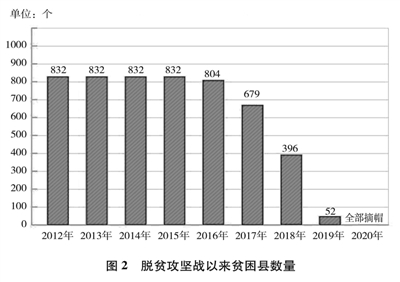 中共十八大以来,经过8年持续奋斗,到2020年底,中国如期完成新时代脱贫攻坚目标任务,现行标准下9899万农村贫困人口全部脱贫(见图1),832个贫困县全部摘帽(见图2),12.8万个贫困村全部出列,区域性整体贫困得到解决,完成消除绝对贫困的艰巨任务。