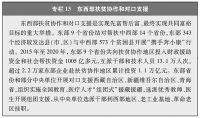 扶贫减贫是艰巨复杂的系统工程,需要调动各方积极参与。为打赢脱贫攻坚战,中国共产党依托严密组织体系和高效运行机制,广泛有效动员和凝聚各方力量,构建政府、社会、市场协同推进,专项扶贫、行业扶贫、社会扶贫互为补充的大扶贫格局,形成跨地区、跨部门、跨单位、全社会共同参与的多元主体的社会扶贫体系。加强东西部扶贫协作和对口支援(见专栏13),推动省市县各层面帮扶,促进人才、资金、技术向贫困地区流动,实现优势互补,缩小区域差距。积极开展定点扶贫,组织各级党政机关、人民团体、国有企事业单位和军队帮扶贫困县或贫困村(见专栏14)。各民主党派、工商联和无党派人士充分发挥各自优势,为打赢脱贫攻坚战献智献力。积极推动各行各业发挥专业优势,开展产业扶贫、科技扶贫、教育扶贫、文化扶贫、健康扶贫、消费扶贫。广泛动员民营企业参与扶贫开发,引导市场开发能力强的主体进入资源开发潜力大的地区,实现互惠互利、共同发展(见专栏15)。广泛动员社会组织、公民个人积极参与脱贫攻坚,开展扶贫公益活动。设立国家扶贫日,建立脱贫攻坚国家荣誉制度,表彰脱贫攻坚先进典型,营造了人人愿为、人人可为、人人能为的社会帮扶氛围。