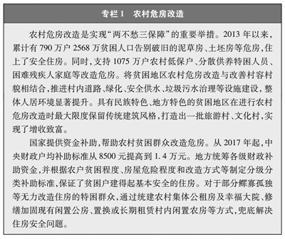 “两不愁三保障”全面实现。脱贫攻坚普查(注8)显示,贫困户全面实现不愁吃、不愁穿,平时吃得饱且能适当吃好,一年四季都有应季的换洗衣物和御寒被褥。贫困人口受教育的机会显著增多、水平持续提高,农村贫困家庭子女义务教育阶段辍学问题实现动态清零,2020年贫困县九年义务教育巩固率达到94.8%。持续完善县乡村三级医疗卫生服务体系,把贫困人口全部纳入基本医疗保险、大病保险、医疗救助三重制度保障范围,实施大病集中救治、慢病签约管理、重病兜底保障等措施,99.9%以上的贫困人口参加基本医疗保险,全面实现贫困人口看病有地方、有医生、有医疗保险制度保障,看病难、看病贵问题有效解决。实施农村危房改造,贫困人口全面实现住房安全有保障(见专栏1)。实施农村饮水安全和巩固提升工程,累计解决2889万贫困人口的饮水安全问题,饮用水量和水质全部达标,3.82亿农村人口受益;贫困地区自来水普及率从2015年的70%提高到2020年的83%。