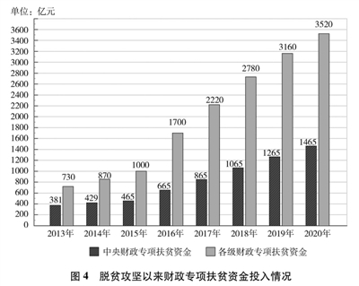 贫困地区发展条件差,贫困人口自我发展能力弱,消除贫困仅仅依靠个体、区域、民间等力量远远不够,必须作为执政党和国家的责任,上升为国家意志、国家战略、国家行动。中国共产党始终把消除贫困作为定国安邦的重要任务,制定实施一个时期党的路线方针政策、提出国家中长期发展规划建议,都把减贫作为重要内容,从国家层面部署,运用国家力量推进。几代中国共产党人,锚定一个目标,一茬接着一茬干。中共十八大以来,中国共产党把脱贫攻坚摆在治国理政的突出位置,加强党的集中统一领导,统筹谋划、强力推进。从党的领袖到广大党员干部,情系贫困群众、心怀减贫大业,全党目标一致、上下同心。加强顶层设计和战略规划,制定印发《关于打赢脱贫攻坚战的决定》《关于打赢脱贫攻坚战三年行动的指导意见》等政策文件,明确目标、路径和具体措施并一以贯之抓下去。各级财政不断加大投入力度(见图4),构建多元资金投入体系(见专栏12),为减贫事业发展提供资金保障。发挥社会主义制度集中力量办大事的优势,广泛动员各方力量积极参与。建立脱贫攻坚责任体系、政策体系、组织体系、投入体系、动员体系、监督体系、考核评估体系等制度体系,为脱贫攻坚顺利推进提供了有力支撑。