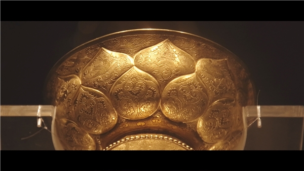 其中的鸳鸯莲瓣纹金碗,被誉为“大唐第一金碗”,好像一朵绽放的莲花,上面的莲花瓣纹是纯手工锤揲出的。上层雕刻着鹦鹉、狐狸等珍禽异兽。鹦鹉在唐代是祥瑞之鸟。唐人认为,鹦鹉能通梦、感神,预知未来,常常与鸳鸯、鸾鸟一起出现在金银器、铜镜上。下层则是各式各样的忍冬花草,有长寿之意。