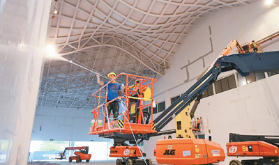 首届中国国际消费品博览会将于5月7日至10日在海南国际会展中心举办,目前各项筹备工作正有序推进。图为4月6日,工作人员在给展馆外墙喷洒涂料。石中华摄(人民视觉)