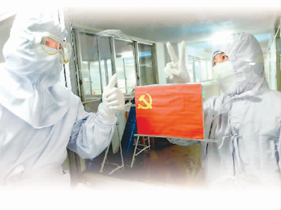 2003年5月11日,在北京中日友好医院非典病区,一面鲜红的党旗格外醒目。共产党员安峥医生(左)走进污染区,与外面的郭彩虹护士长做手势相互鼓励。记者 李舸摄