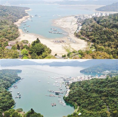 图为今年三月(上)与去年九月(下)日月潭水域范围的对比图。图片来源:网络