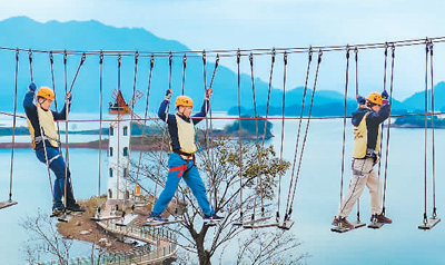 游客在浙江淳安千岛湖啤酒小镇驴营地探险乐园进行高空探险体验。毛勇锋摄(人民视觉)