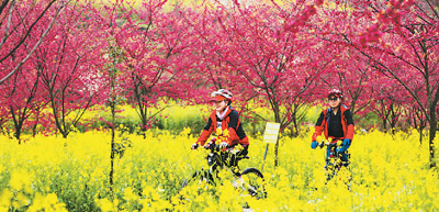 骑行爱好者在贵州省毕节市黔西县林泉镇中国红樱花基地骑行赏花。韩贤普摄(人民视觉)