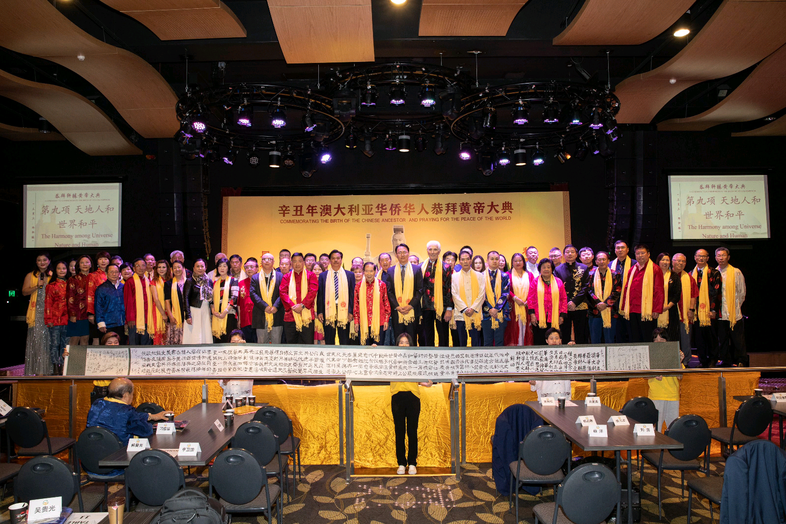 悉尼卡拉玛塔会议中心大厅内,鲜花簇拥着巨幅轩辕黄帝座像。画像两侧展示着拜祖大典的主题:“同根同祖同源,和平和睦和谐”。百家姓氏旗布满四周,彰显出中华民族的历史传统和丰富文