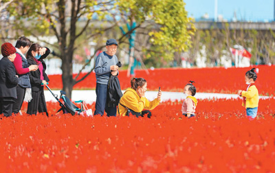 近年来,江苏省南通市全面实施滨江片区生态修复和城市更新。图为市民在南通滨江景观带留白区的“生态花海”里游玩。 翟慧勇摄(人民视觉)