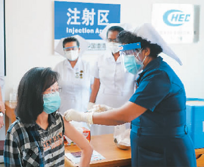 四月五日,在斯里兰卡科伦坡港口城疫苗接种点,一名中国公民接种疫苗。 新华社记者 唐 璐摄