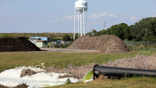 4月6日,佛罗里达州工业废水池泄露事件中,被抽取的废水直接流入排水沟。(图片来源:美联社)
