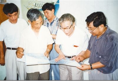彭士禄(右二)与科研人员讨论工作(资料照片)。中国核工业集团有限公司供图