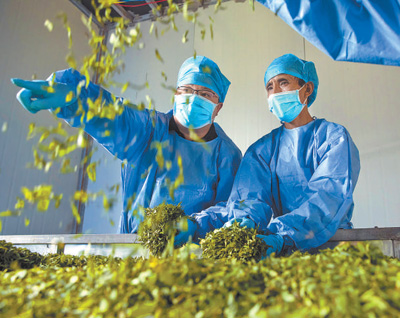 2020年8月14日,在位于四川省凉山彝族自治州昭觉县龙沟乡的茶坊,当地干部(左)指导彝族村民制茶。新华社记者 沈伯韩摄