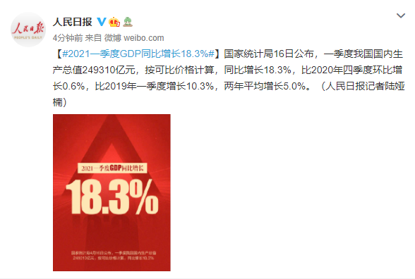 国家统计局:2021一季度GDP同比增长18.3%