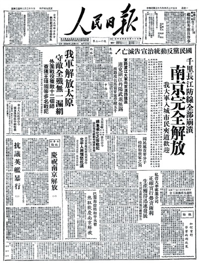 1949年4月25日出版的人民日报头版。资料图片