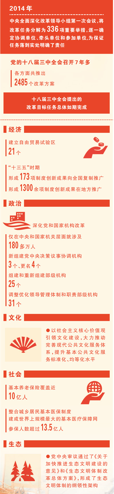 翻开这份决定,从以经济体制改革为主到全面深化经济、政治、文化、社会、生态文明体制和党的建设制度改革,是新中国成立以来最为全面系统的改革部署。