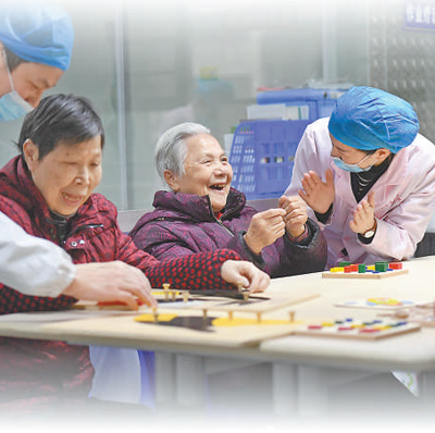 近年来,江西省宜春市积极探索推进新型养老模式,基本建成覆盖城乡、功能合理、服务多样的医养结合服务体系。图为医护人员在协助老人进行康复训练。周 亮摄(影像中国)