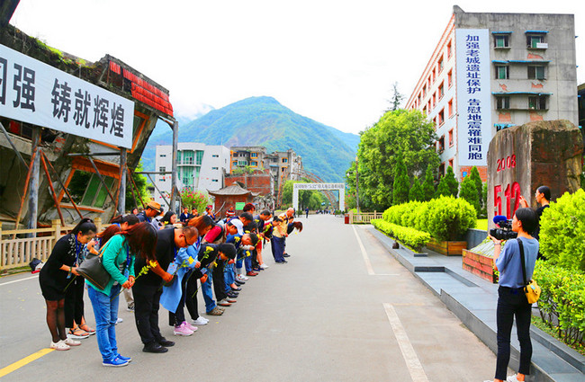 参加本次参访活动的海内外媒体负责人集体向地震灾区的逝者默哀献花