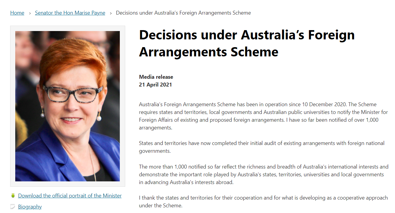 根据法案,所有州政府、地方政府和大学必须向联邦政府通报所有与外国政府现有的协议,联邦政府之后会公开这些协议让公众查阅。外长同时会逐一检视它们,如果认为这些协议违背澳大利亚外交政策或损害澳外交关系,外长有权取消它们。就在澳方宣布撕毁“一带一路”协议当天,佩恩也辩称“澳大利亚不是针对中国”。
