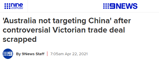 4月21日,澳大利亚联邦政府宣布取消维多利亚州与中国此前签署的“一带一路”备忘录和框架协议。中国驻澳大利亚大使馆回应称,澳方此举是针对中方的又一无理挑衅行径。有分析称,去年澳大利亚通过的《对外关系法案》指向目标之一就是维州与中国签署的“一带一路”有关协议。《悉尼先驱晨报》称,这将进一步加剧堪培拉与北京之间的紧张关系。