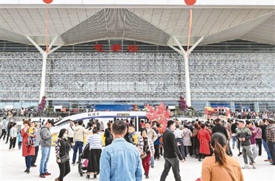 广清城际铁路花都站外旅客如云。 中新社记者 陈骥旻摄
