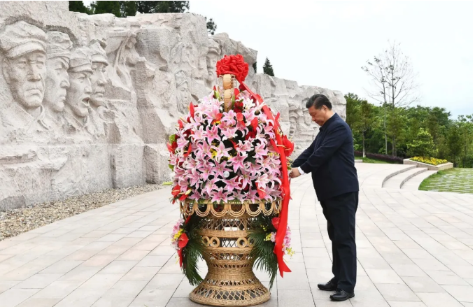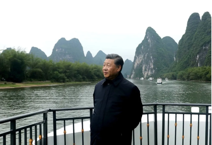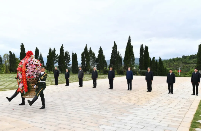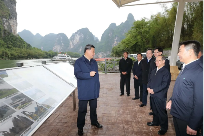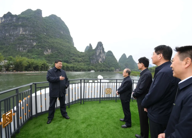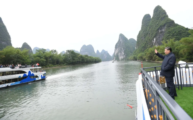 4月25日上午,习近平总书记来到位于广西桂林全州县才湾镇的红军长征湘江战役纪念园,向湘江战役红军烈士敬献花篮,参观红军长征湘江战役纪念馆,缅怀革命先烈、赓续共产党人精神血脉。随后,习近平来到才湾镇毛竹山村,考察推进乡村振兴、基层治理等情况。当天下午,习近平在漓江阳朔段实地了解漓江流域综合治理、生态保护等情况。