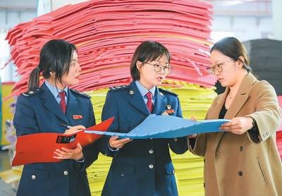今年以来,山东青岛前湾保税港区税务局深入推进税收领域“放管服”改革,联合山东自贸区青岛片区和青岛海关推出信用合作机制,服务市场主体发展。图为税务局工作人员在企业了解生产情况。 张进刚摄(人民视觉)