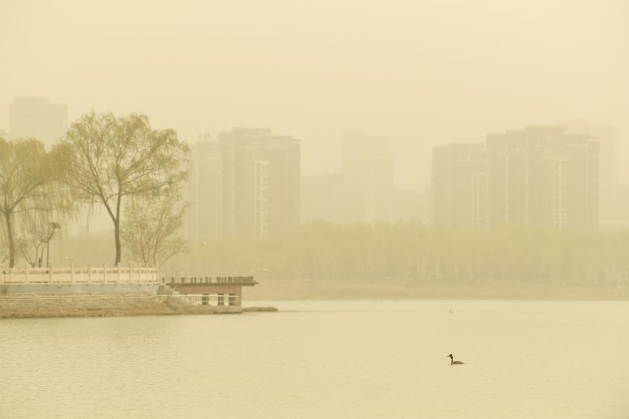 上图:3月底,我国北方地区遭遇沙尘天气,图为候鸟在宁夏银川市陈家湖湖面上游弋。(新华社记者冯开华/摄)
