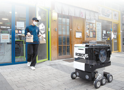 韩国首尔一商业区,送餐机器人协助服务员工作。影像中国