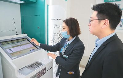 为了改善硬币流通环境,节省人力物力,中国农业银行江苏镇江孟湖支行引进硬币存兑一体机,有效解决了硬币存入和兑换难的问题。图为在镇江市农行营业厅,顾客在工作人员的指导下使用硬币存兑一体机。封疆江摄(人民视觉)