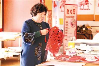 在赵美玲工作室的墙上,有一幅两米高的剪纸,上面是中国古代武将——关羽。记者发现,这幅作品和赵美玲的其他作品不甚相同,许多细节并非传统剪纸的表现形式,而是借鉴了动漫和游戏作品中人物形象的元素。赵美玲告诉记者,这是她的一名年轻学生创作的。“咱们的剪纸图案也不能一成不变,看到好看的图案,也要借鉴过来。在这一块,年轻人做的比我好多了。”如今在赵美玲的带领下,越来越多的年轻人参与到剪纸的传承工作中,并往这项古老的技艺中加入越来越多富有活力的内容。
