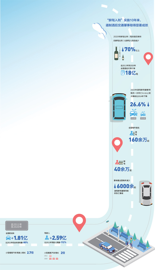 “总体来看,自2011年‘醉驾入刑’至2020年,全国机动车增加1.81亿,驾驶人增加2.59亿,年均增长1800万辆、2600万人,但10年来全国交通安全形势总体稳定。” 公安部交通管理局相关负责人说,这一成绩的取得,“醉驾入刑”功不可没,挽救了无数生命,也让无数家庭得以平安。