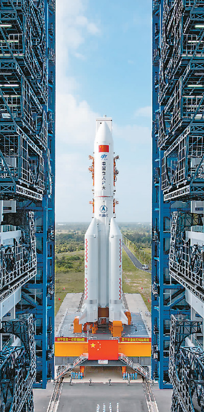 位于发射区的空间站天和核心舱与长征五号B遥二运载火箭组合体。中国运载火箭技术研究院供图