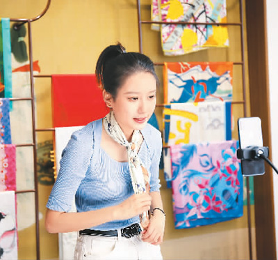 浙江省杭州市桐庐县横村镇有“中国围巾之乡”“中国针织名镇”之誉。图为横村镇中国围巾城内,一名主播正在直播推荐商品。徐军勇摄(人民图片)
