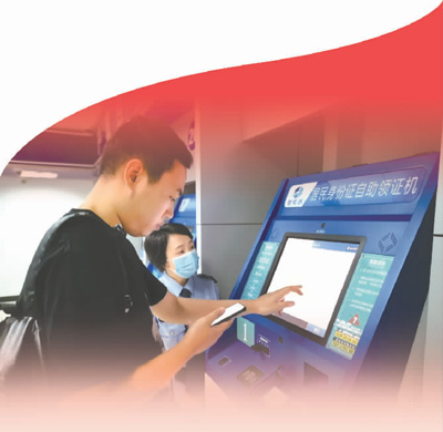 2020年10月27日,广州公安机关工作人员在帮助市民使用居民身份证自助领证机。新华社发