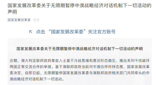 国家发改委公众号6日发布《国家发展改革委关于无限期暂停中澳战略经济对话机制下一切活动的声明》,全文如下: