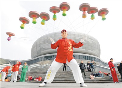4月24日,在河北省邯郸市文化艺术中心广场,空竹爱好者展示空竹绝活。郝群英摄(人民视觉)