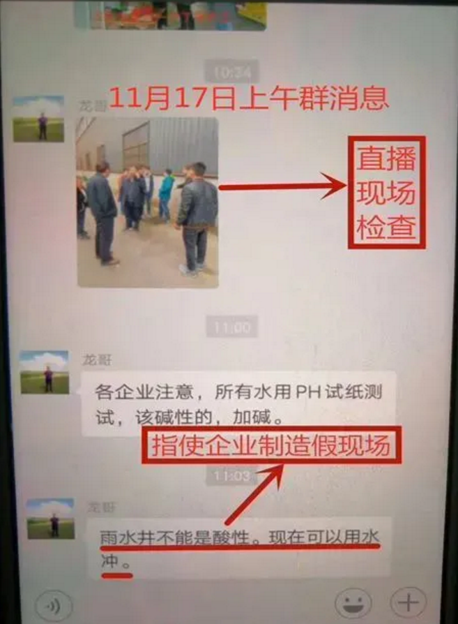 比如,针对检查发现雨水沟呈酸性的问题,“龙哥”在群里提醒“雨水井不能是酸性,现在可以用水冲”;针对检查发现危险废物非法处置的问题,“龙哥”指使企业制造假现场、假合同。