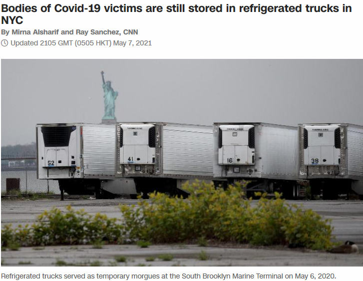 据美国有线电视新闻网(CNN)7日报道,2020年3月底,美国新冠肺炎死亡人数激增,医院、停尸房和殡仪馆数量严重不足,因此改装冷藏卡车成为医院外的临时停尸房。根据美疾控中心数据,2020年4月初,纽约市仅一天内就有800多人死于新冠肺炎,而在4月5日当周,该市平均每天有566人死亡。联邦紧急事务管理局向纽约提供了80辆冷藏卡车。