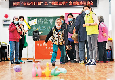 4月2日,在天津市河西区桃园街道居家养老服务中心二楼,一场别开生面的中老年人健康趣味运动会正在举行。来自社区的部分中老年人参加了保龄球、套圈、射箭等趣味项目活动。