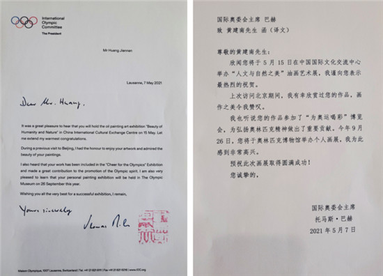巴赫在《贺信》(上图,右为译文)中说:“我谨向您表示最热烈的祝贺!我也听说您的作品参加了‘为奥运喝彩’博览会,为弘扬奥林匹克精神做出了重要贡献。今年9月26日,您将于奥林匹克博物馆举办个人画展,我为此感到非常高兴!”