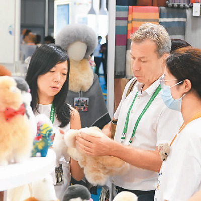 5月7日,人们在首届消博会秘鲁品牌Warmpaca展位挑选玩偶。新华社记者 杨冠宇摄