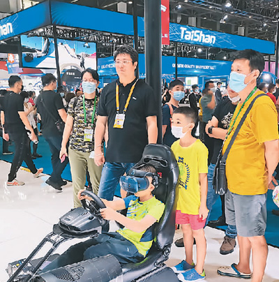 5月9日,旅居生活和服务消费展区内,观众在戴尔展台体验VR游戏。本报记者 邱海峰摄