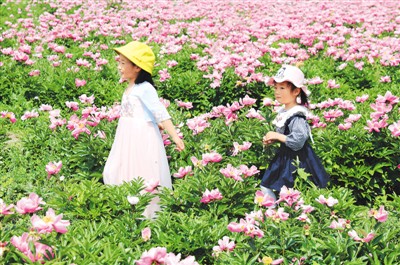 安徽省淮北市相山区渠沟镇鲁楼村芍药种植基地的芍药花开正艳,吸引市民前来赏花游玩。李 鑫摄(人民图片)