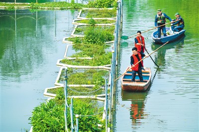 浙江省湖州市长兴县太湖街道白溪港内,志愿者和村级河长正在进行水面漂浮物打捞。