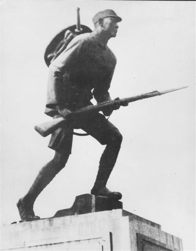 如果说李桦、张善孖等是以象征的手法,吹响奋起抵抗的号角,那么以刘开渠为代表的一批美术工作者,则以写实的语言,奏响气吞山河的爱国主义壮歌。1944年,刘开渠为纪念抗日阵亡将士,创作雕塑《无名英雄纪念碑》。在艰苦的条件下,刘开渠饱含激情地塑造了一位端着长枪、向前冲锋的普通战士形象。“他”身背斗笠,穿着短裤,打着裹腿,足蹬草鞋,双唇紧闭,怒视前方。整座雕像形体简洁,情态生动,展现出主人公视死如归、宁死不屈的气节。