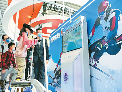 日前,福建省福州市马尾区魁岐小学二年级学生在第四届数字中国建设峰会数字成果展览会上通过VR设备体验冬奥滑雪项目。陈 彬摄(人民图片)